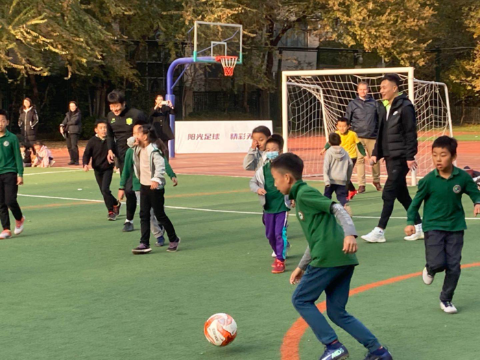 活动当天还邀请到了前国脚徐阳、张辛昕、隋东亮来到活动现场,一起与学生们进行互动。由徐阳担任解说,张辛昕、隋东亮与孩子们进行的2V8足球比赛让孩子们亲身参与到足球比赛激烈的进攻与防守中,与技巧娴熟的退役球星同场互动,充分享受到了足球运动的快乐,亲身体验了足球竞技的魅力。
