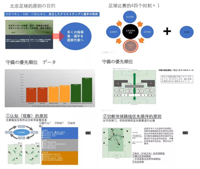 课程中讲解了北京青少年足球的原则目的、足球比赛的四个时刻、防守的优先顺位、认知(观察)的原则、切断传球路线优先顺序原则等。