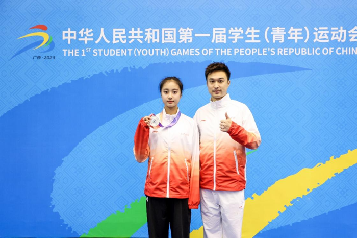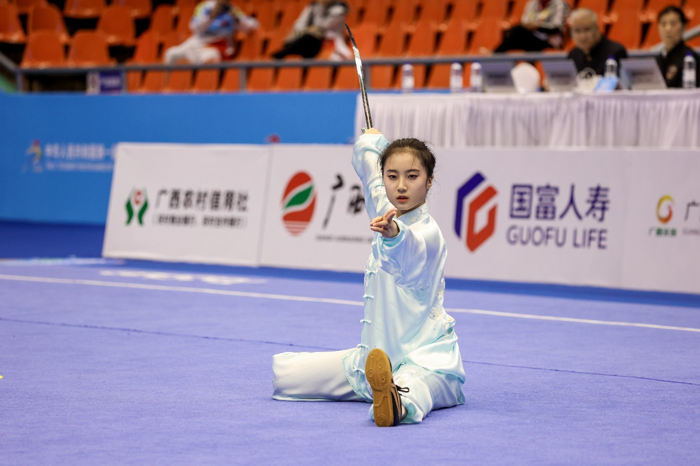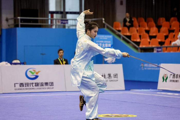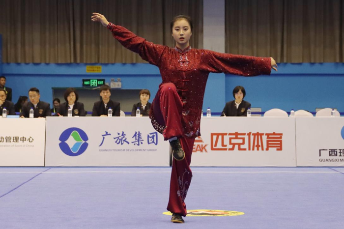 11月13日,第一届全国学生(青年)运动会武术套路(公开组)比赛女子太极拳+太极剑全能项目的第二个比赛日在广西壮族自治区体育馆展开激烈角逐。来自北京市朝阳区代表队的杨瑾发挥出色,以优异的成绩获得了该项目的亚军,为北京代表团再添一枚银牌。