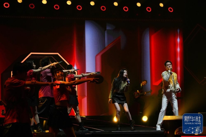 ↑演员在开幕式上表演音乐节目《北京欢迎你》。