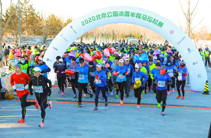 2020年12月13日上午,由北京市体育总会主办,北京市体育总会秘书处、北京马拉松协会承办的2020北京公园冰雪半程马拉松赛在温榆河公园成功举办。500余名跑者在风景如画的雪后奔跑,在跑道上奔放出银妆世界的动感气息。