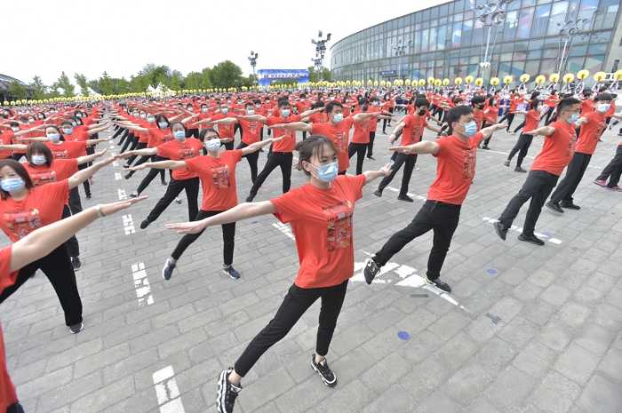 昔日的北京奥运会水上比赛场地,陆地上草坪绿意盎然鲜花盛开,水面波光旖旎,体育节开幕式当天变成运动健身的海洋。开幕式由仪式和全民健身比赛活动组成,仪式部分包含广播体操展示和开幕式;比赛部分包含健步走、轮滑、健身操舞、龙舟、风筝、广场舞、冰上体验课等项目,分别在陆、水、空、冰四个维度展开,参与人群覆盖少年儿童、青壮年、中老年,全面展现北京市全民健身事业发展的辉煌成果,向建党百年献礼。