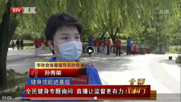8月份,在市体育局的大力推荐和支持下,在北京市社会体育管理中心和北京市体育总会秘书处的具体指导下,北京市社会体育指导员协会推荐数十名北京市社会体育指导员参加了北京广播电视台的拍摄录制,大力宣传北京市全民健身志愿服务工作。拍摄的节目于8月底分别在北京电视台新闻和科教频道播出。