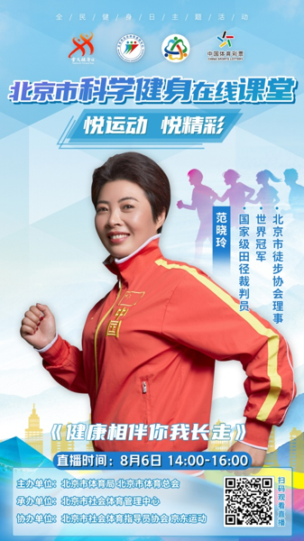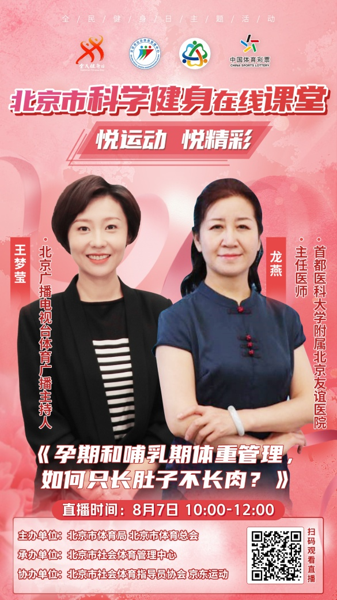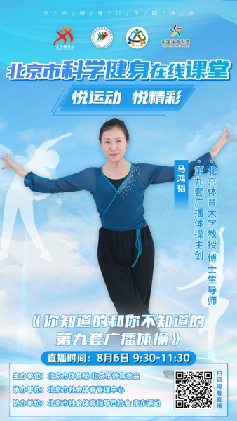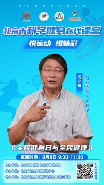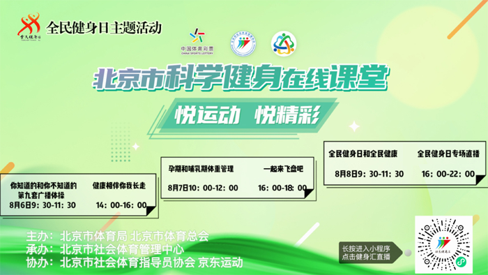 由北京市体育局、北京市体育总会主办,北京市社会体育管理中心承办的北京市科学健身指导大讲堂,拟于第14个“全民健身日”期间(8月6日至8日),采取网络直播的方式进行授课,向市民宣传健身知识、传授健身技能,敬请关注。