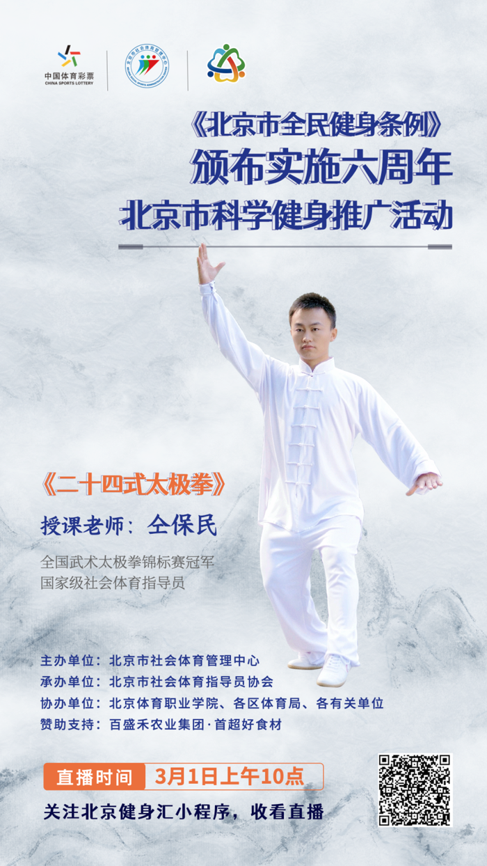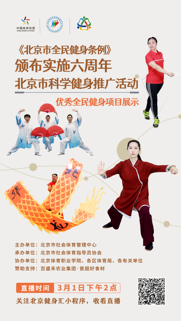 为贯彻落实全民健身国家战略,展示首都全民健身发展成果,展现首都全民健身参与者阳光健康热情的良好精神风貌,《北京市全民健身条例》颁布实施六周年北京市科学健身推广活动将于3月1日全程线上直播,直播入口如下,欢迎观看和转发。