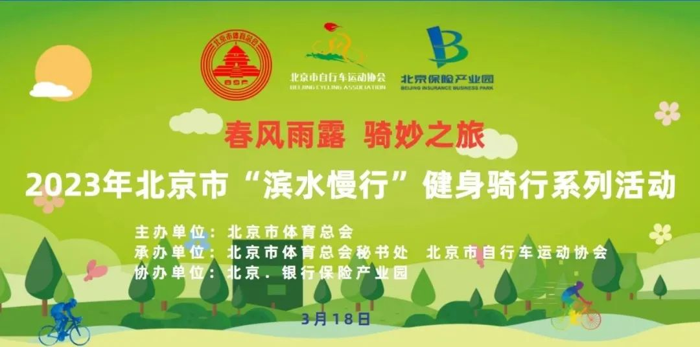 由北京市体育总会主办,北京市体育总会秘书处、北京市自行车运动协会承办、北京·银行保险产业园协办的2023年北京市“滨水慢行”健身骑行系列活动将于3月18日在北京·银行保险产业园中心广场举行。