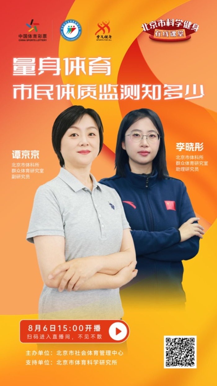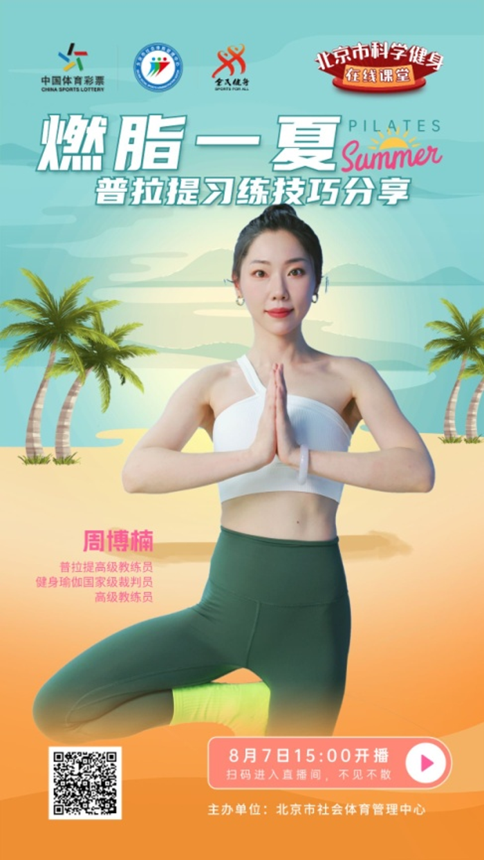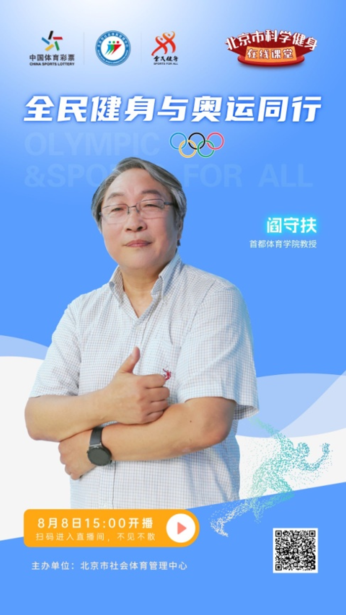 2024年8月8日是我国第16个“全民健身日”,为鼓励人人健身、天天健身、科学健身,唱响“全民健身与奥运同行”。北京市社会体育管理中心拟定全民健身日期间(8月6日至8日), 开展北京市科学健身在线课堂活动,直播海报附后,敬请收看。