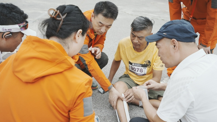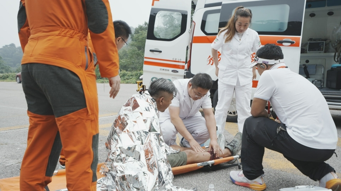 在演练中,一名参加“北京慕田峪长城100挑战赛”的运动员在赛道上不幸摔伤骨折。赛事志愿者第一时间发现情况,并迅速上报给赛事组委会。