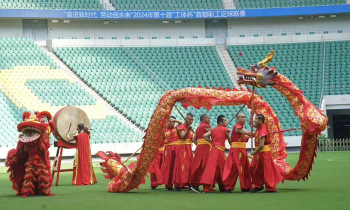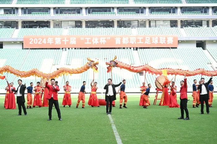 富有中国传统文化特色的擂鼓舞龙舞狮表演,集聚力量与健康之美的创意工间操展示,北京职工艺术团男声组合激情澎湃地演唱歌曲《胜利与辉煌》……揭幕友谊赛开始前,一个个精彩的节目充分展现了首都职工昂扬向上、积极进取的精神风貌,也把现场的氛围带动得更加火热。
