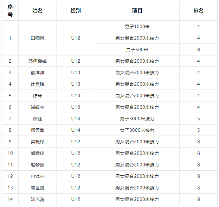 U14组:500米、1000米、1500米、3000米接力、男女混合2000米接力;