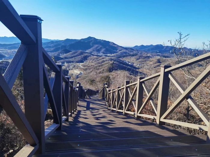 穆家峪镇阁老峪村登山步道是沿西侧景区山脊修建而成,为人工防腐塑木材质木栈道,底层是镀锌钢骨架,面层铺装人工防腐塑木,两侧设人工防腐塑木栏杆。步道全长1390米,平均宽度2米,全程设两个休息观景平台,安装有休息座椅、导视牌、警示牌、里程标牌和垃圾桶等附属设施,可满足游客停留休憩。登山游客从南侧起点登山赏景,沿台阶登级而上,平坦舒适的塑木步道让人心旷神怡,沿步道到达北侧山顶,密云水库全景尽收眼底。