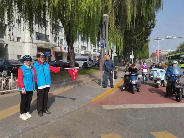 在文明引导员休假期间,自行车协会会员们在东关环岛、夏都公园、妫川广场等地路口进行道路引导。遇到老人、小孩过马路时,会员们主动上前搀扶帮助。他们的细心与关爱,让群众感受到了温暖,同时确保了假日期间延庆城区主要路口行人的有序通行。
