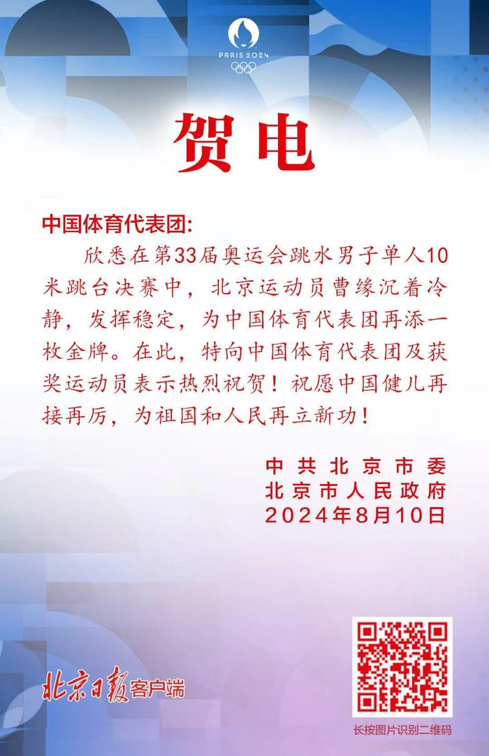 北京运动员曹缘夺金 市委市政府致贺电
