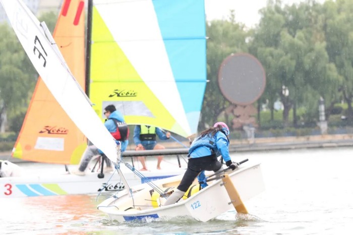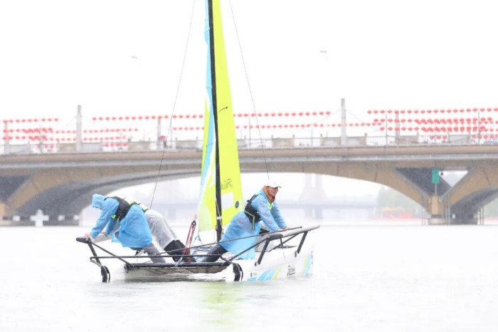 成人组的较量则更具张力。驾驶着HOBIE双体帆船的选手们,凭借强劲臂力拉动帆索,船身在水面上飞速疾驰,激起的白色浪花与雨丝交织成网。最终,成人组冠军由中国地质大学帆船队获得、北京大学未名领航帆船队获得亚军和么哈帆船队获得季军。