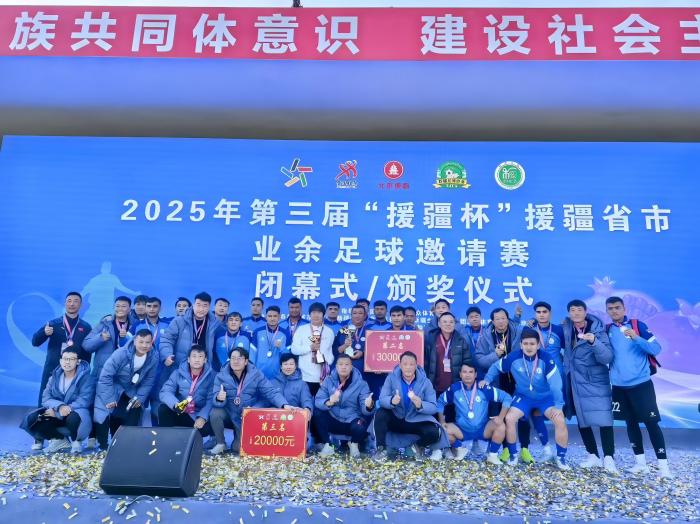 2025年10月28日,随着第三届“援疆杯”援疆省市业余足球邀请赛在新疆和田地区墨玉县圆满落幕,由北京市体育局选派的北京代表队以昂扬姿态完成赛事征程,在全体教练员、队员的努力拼搏下,团结一心、不畏强手,经过七天六场次的激烈角逐,最终荣获赛事第三名的优异成绩。不仅在绿茵场上展现了竞技实力,更以体育为媒深化京疆情谊,成为本届赛事中“首都力量”的生动注脚。