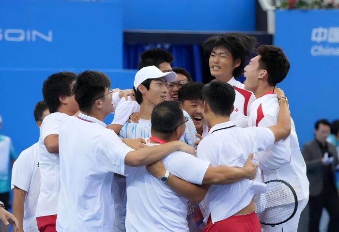 11月12日下午,先农坛体校网球运动员商竣程、齐洪瑾、张博雄、宋雨桥、孔维一获得十五运会网球青年组男子团体冠军,为北京代表团赢得本届全运会网球项目首枚金牌。