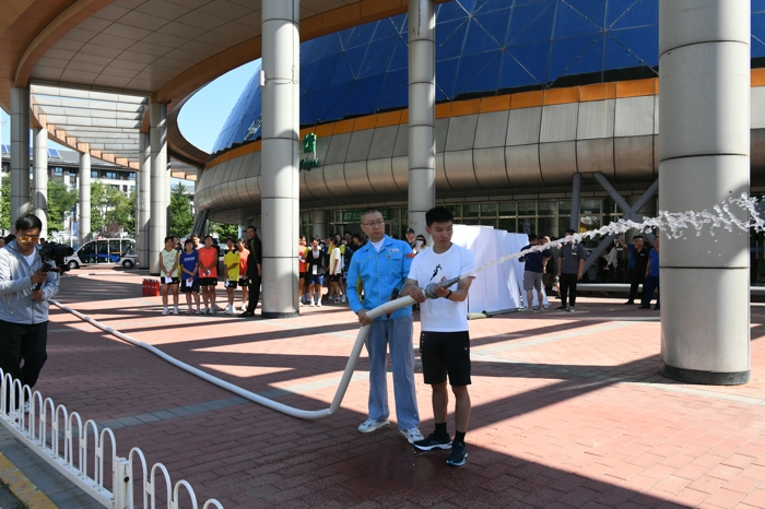 随后,演习人员在中心训练馆进行了场景模拟撤离逃生演练。现场拉响警报后,立即启动场馆应急预案,健身群众在场馆工作人员的指挥下,用湿毛巾捂着口鼻进行紧急有序疏散,按照“就近”疏散的原则,将所有人紧急疏散至场馆外安全区域。在消防知识与技能培训中,专业人员“手把手”教学,带领观摩人员现场演示初期火灾扑救技能,帮大家掌握正确应急逃生要领。进一步增强了体育行业经营者应急避险的实战能力。