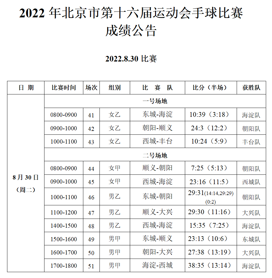 北京市第十六届运动会手球比赛(青少年竞技组)8月30日比赛成绩公告