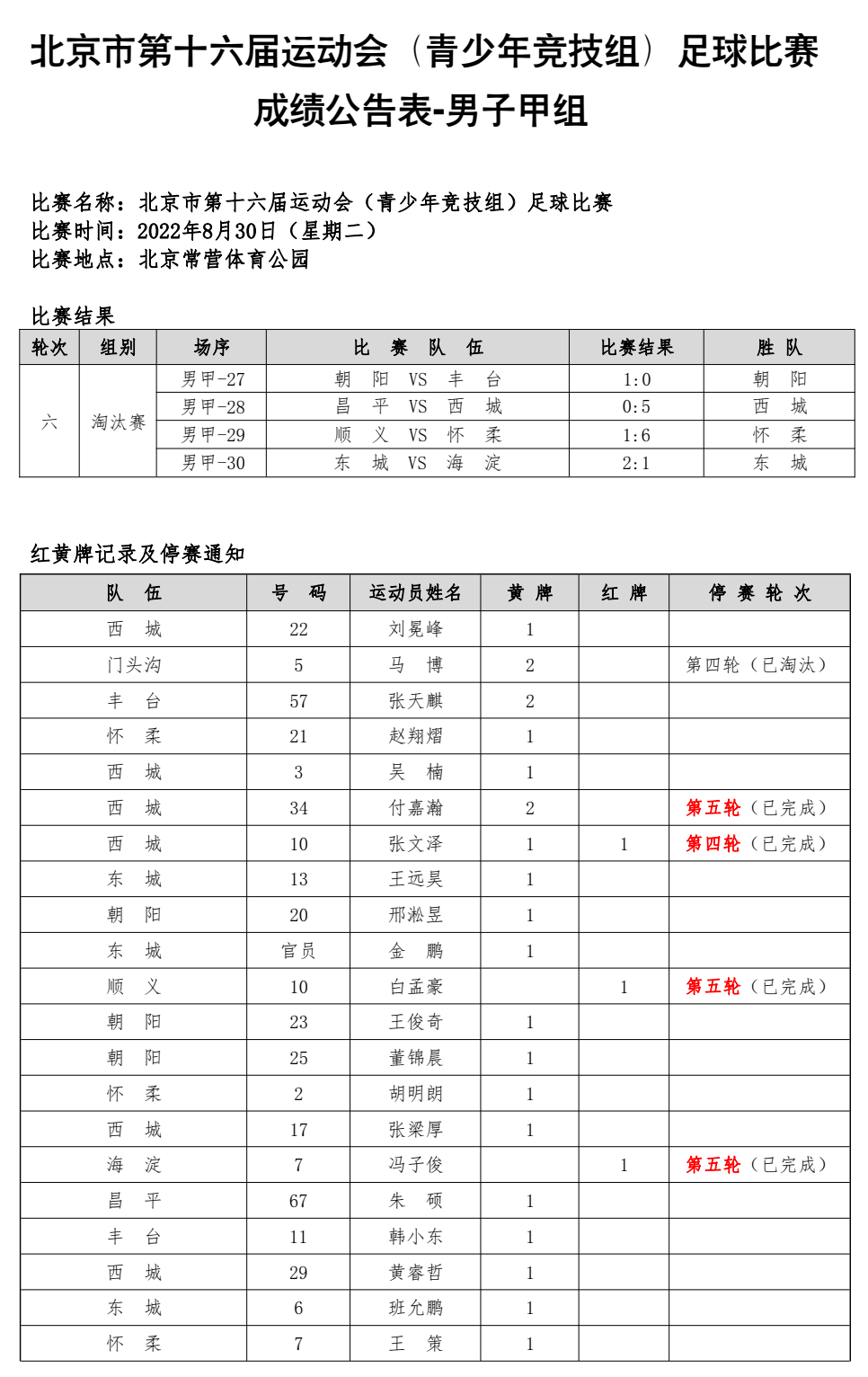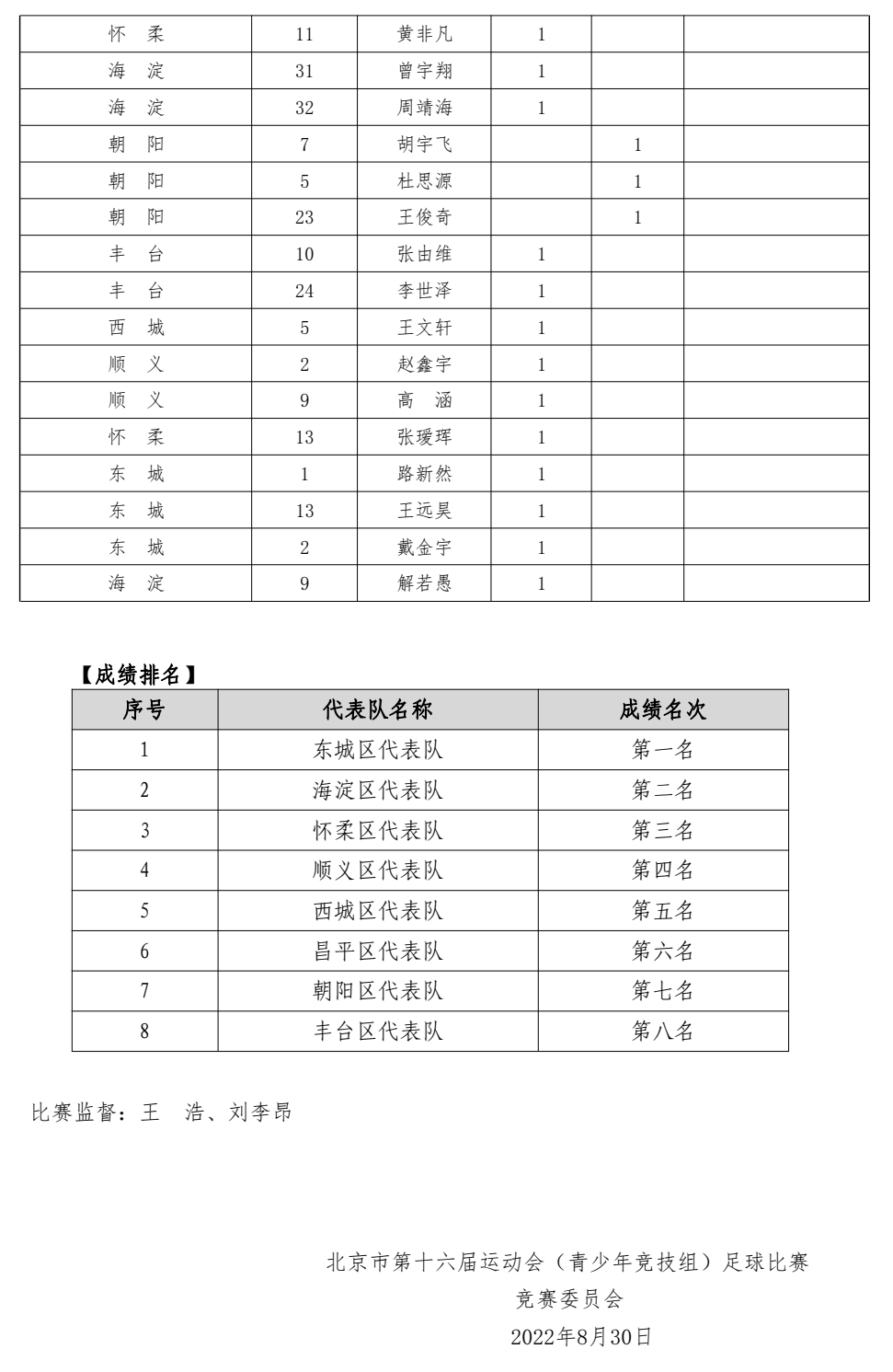 北京市第十六届运动会足球比赛(青少年竞技组)8月30日比赛成绩公告