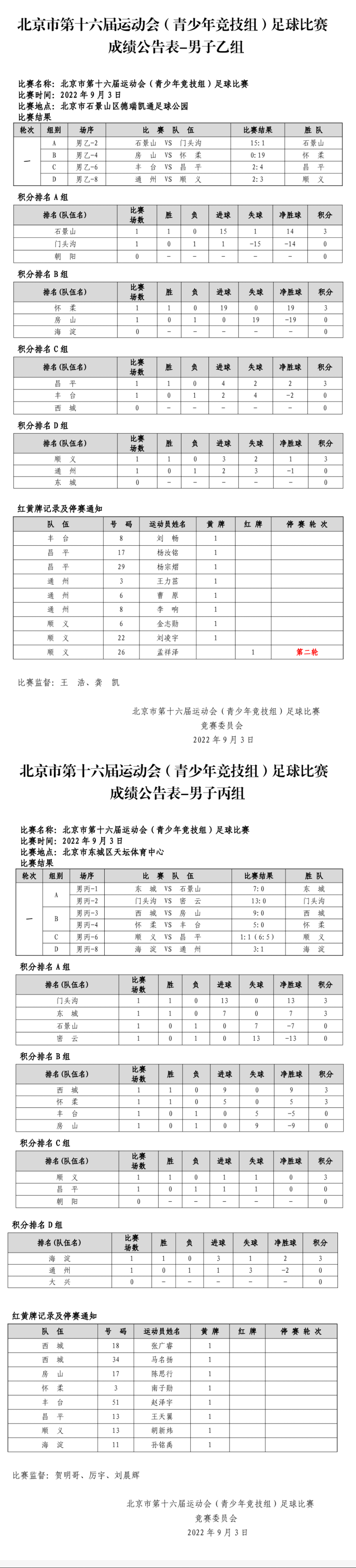 北京市第十六届运动会足球比赛(青少年竞技组)9月3日比赛成绩公告