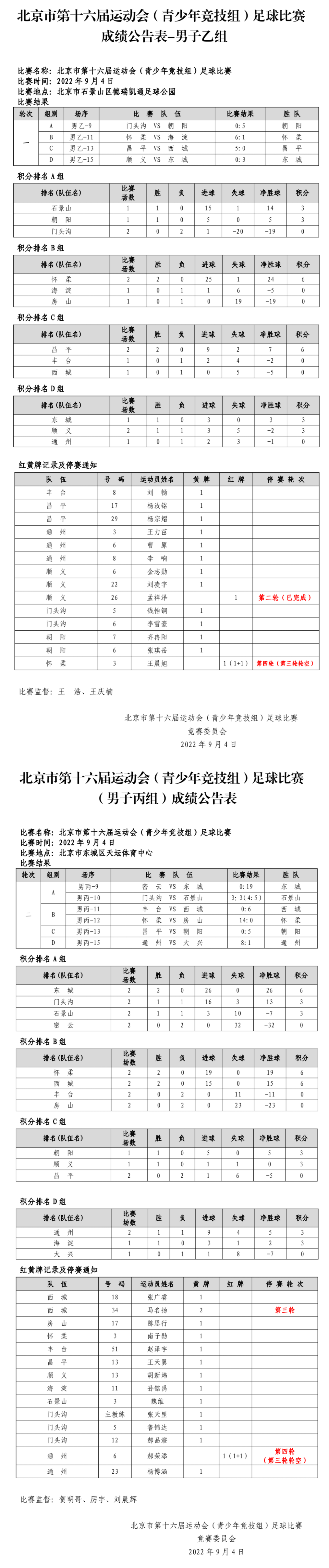 北京市第十六届运动会足球比赛(青少年竞技组)9月4日比赛成绩公告